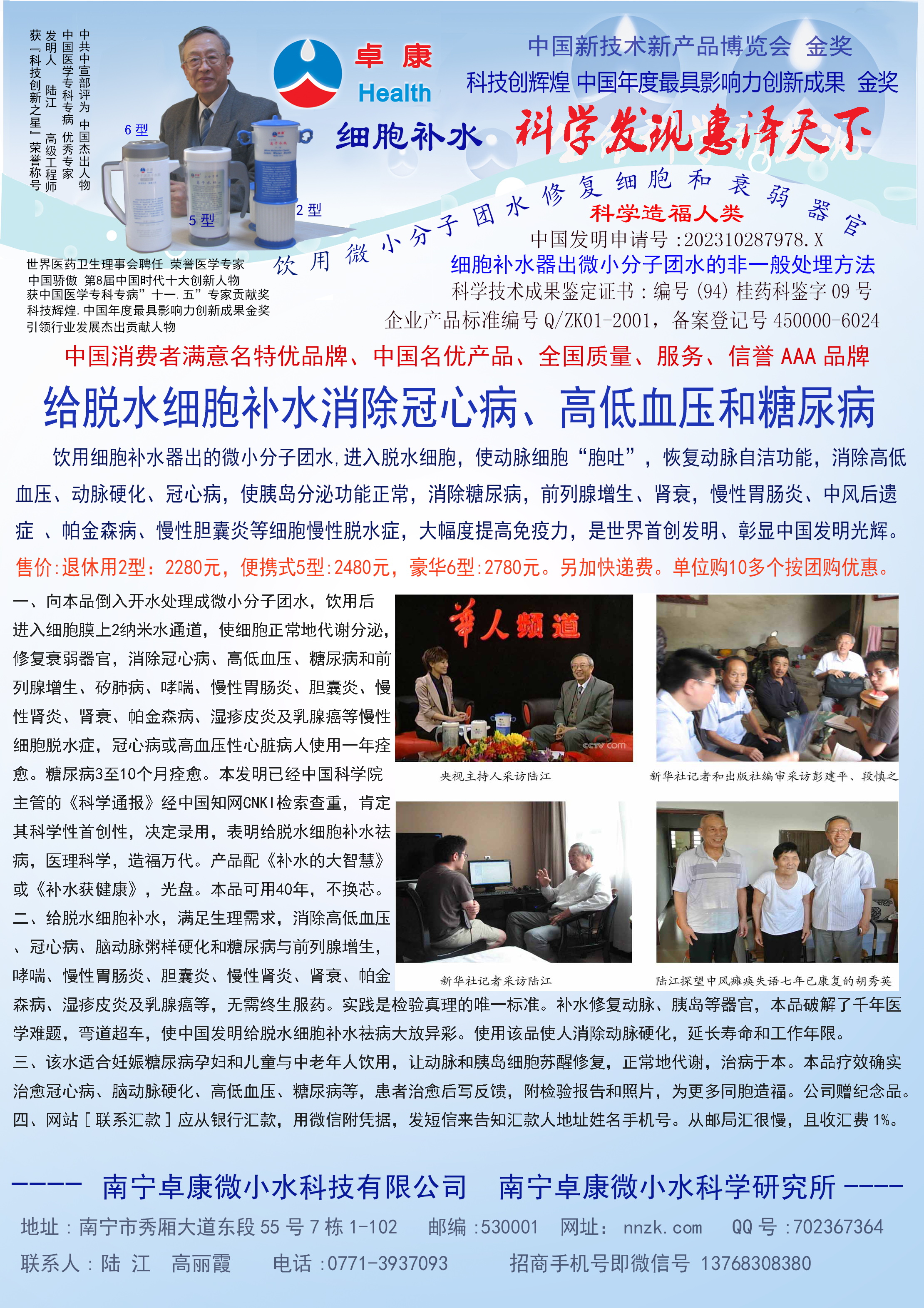 人類(lèi)幾千年來(lái)患以上病癥需終生服藥,幾十年也不能治愈。可是我國(guó)南寧的高級(jí)工程師陸 江,于1990年想根治高血壓,研究發(fā)明了離子水瓶,處理出微小分子團(tuán)水供飲用,經(jīng)過(guò)醫(yī)院臨床試用和專(zhuān)家鑒定,1999年獲中國(guó)發(fā)明專(zhuān)利權(quán),產(chǎn)品于2000年投放市場(chǎng)后一直跟蹤調(diào)查,據(jù)全國(guó)各地用戶(hù)反饋:祛除了高低血壓、糖尿病和冠心病,并使前列腺增生、咽喉炎、鼻竇炎、慢性氣管炎、支氣管炎、矽肺病、哮喘、慢性胃炎、腸炎、慢性膽囊炎、慢性腎炎、腎衰、膀胱炎、便秘、痔瘡、風(fēng)濕性關(guān)節(jié)炎和濕疹皮炎及中風(fēng)后遺癥等病癥不藥而愈。為什么喝微小水能治20多種病?陸 江從1991年德國(guó)科學(xué)家發(fā)現(xiàn)細(xì)胞膜水通道僅為2納米獲得啟發(fā),認(rèn)為多種器官患病是因細(xì)胞脫水,不能正常代謝和分裂增殖,才使器官細(xì)胞減少致衰弱萎縮而形成細(xì)胞缺水性病癥。22年來(lái)的實(shí)踐有力地支持了“細(xì)胞脫水致病”這一重要論點(diǎn),表明喝微小水可滿(mǎn)足細(xì)胞的生理需求,補(bǔ)水就能祛病,是生命科學(xué)新亮點(diǎn)。